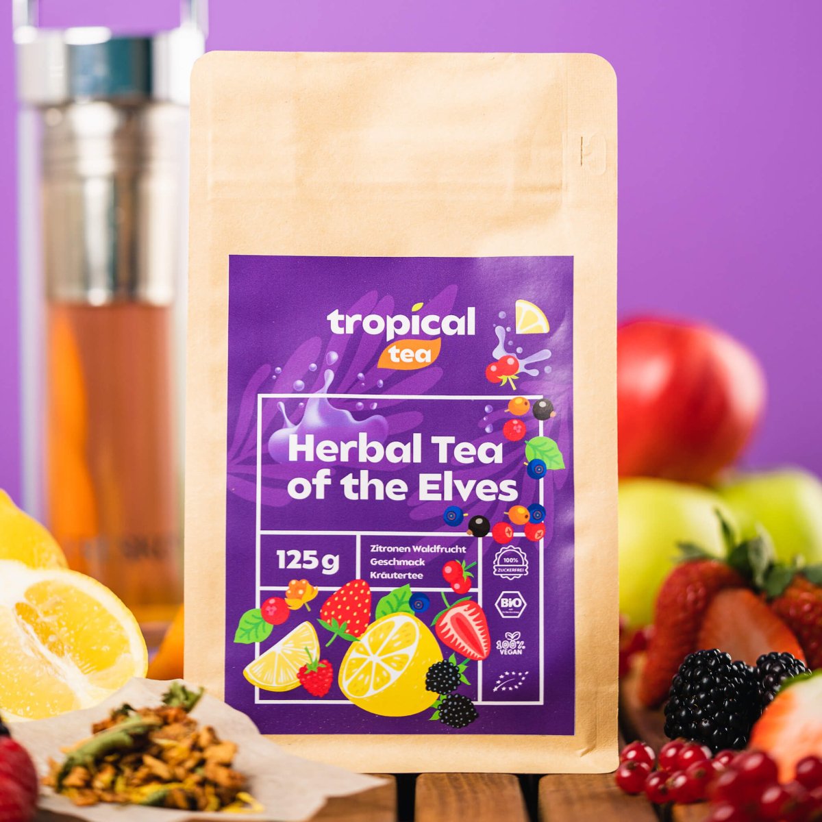 Herbal Tea of the Elves Tee – Unser Herbal Tee entführt Dich in eine Welt der Träume und Entspannung. Der fruchtige Kräutertee mit Zitronen-Waldfrucht-Geschmack ist genau richtig, wenn Du nach einem langen Tag runterkommen willst. Eine fein abgestimmte und durchdachte Mischung aus Kräutern, Pflanzen und Früchten verleiht Dir neue Kraft und beruhigt Deine Nerven. Willst Du es ausprobieren? Dann bestelle jetzt Deinen neuen Lieblingstee.